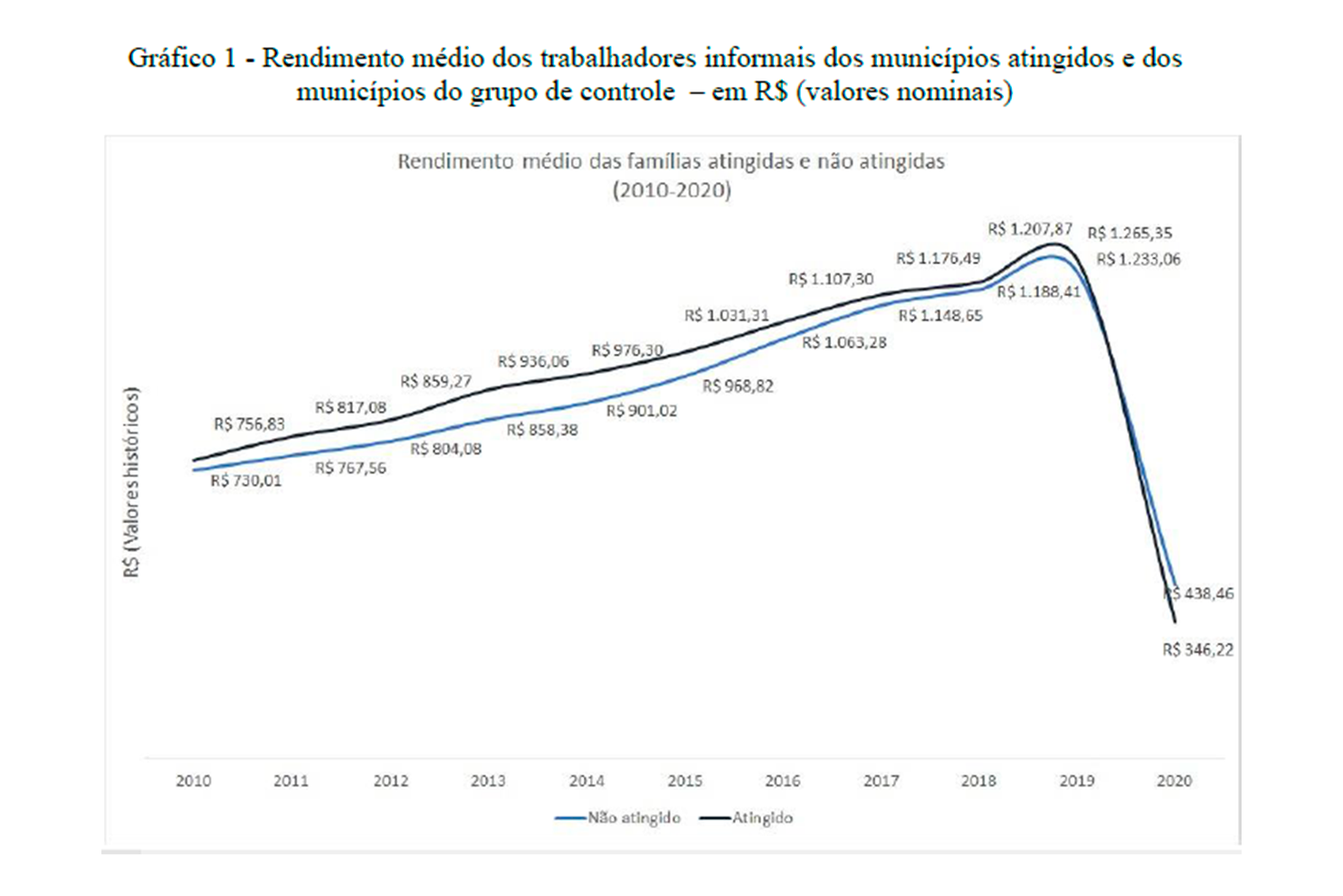 Os resultados apontam que o rompimento da barragem impactou, negativamente, o rendimento do trabalho informal nos 19 municípios atingidos. A pandemia do COVID levou à queda dos rendimentos de ambos os grupos (municípios atingidos e não atingidos). O gráfico a seguir mostra que, entre 2010 e 2019, houve um crescimento considerável na renda média dos trabalhadores informais, contudo, em 2020, percebe-se uma queda drástica, relacionada à pandemia. Ainda assim, enquanto os municípios não atingidos apresentam um rendimento médio de R$438,46, os municípios atingidos chegam ao valor de R$346,22, uma diferença de R$92,24.