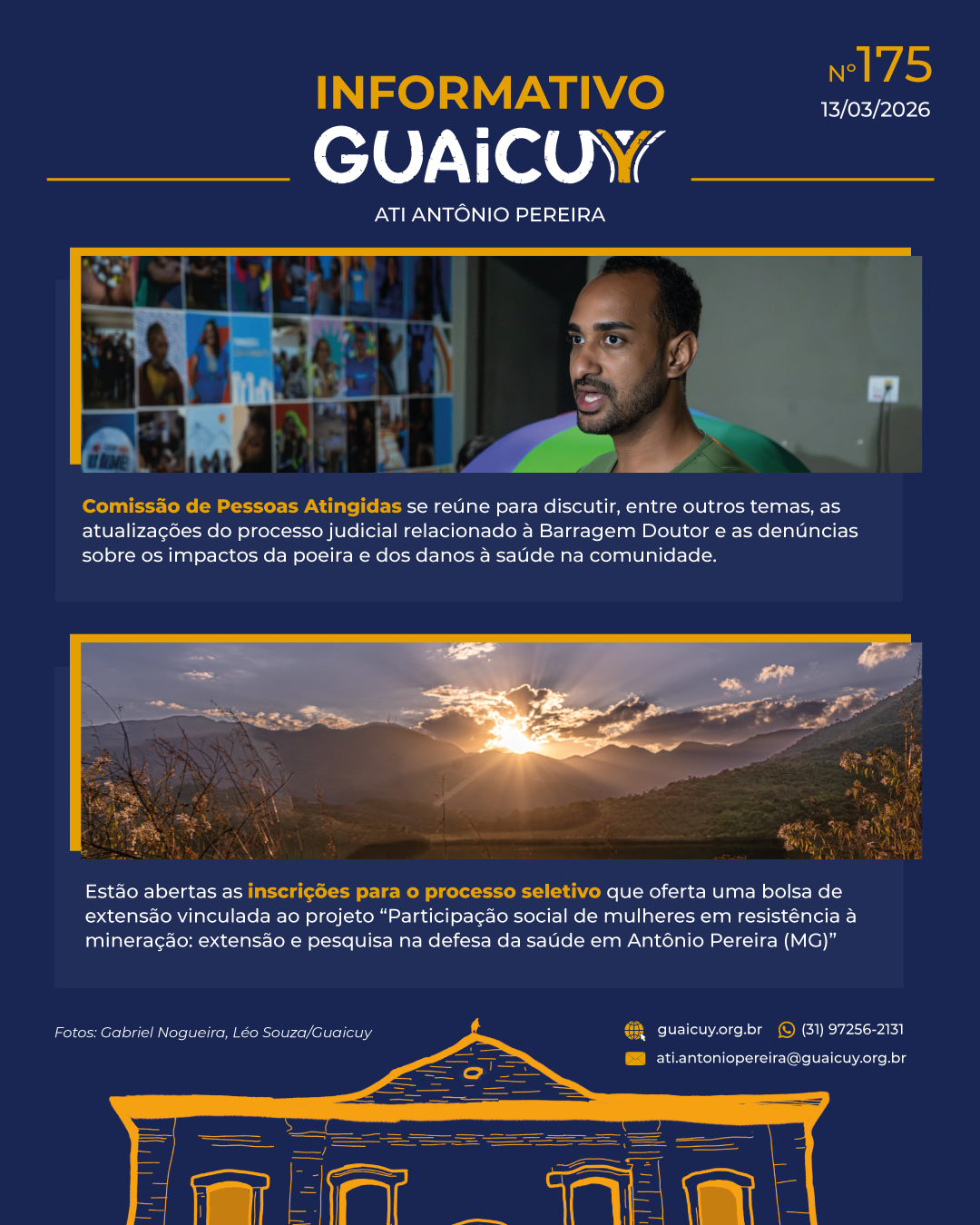 A Comissão de Pessoas Atingidas de Antônio Pereira realizou, na noite de ontem, 12 de março, mais uma reunião ordinária no escritório da ATI. Entre os principais temas debatidos estiveram as atualizações do processo judicial relacionado à Barragem Doutor e as denúncias sobre os impactos da poeira e dos danos à saúde na comunidade.