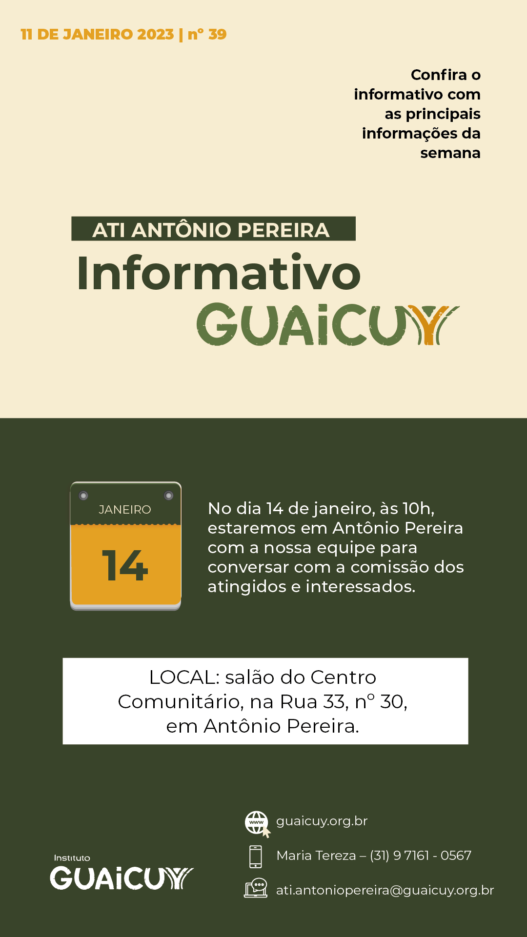 No dia 14 de janeiro, às 10h, estaremos no distrito com a nossa equipe para conversar com a comissão dos atingidos e interessados. A reunião será feita no salão do Centro Comunitário (Centro Promocional e Educacional Padre Ângelo), na Rua 33, número 30, em Antônio Pereira. Contamos com a sua presença!