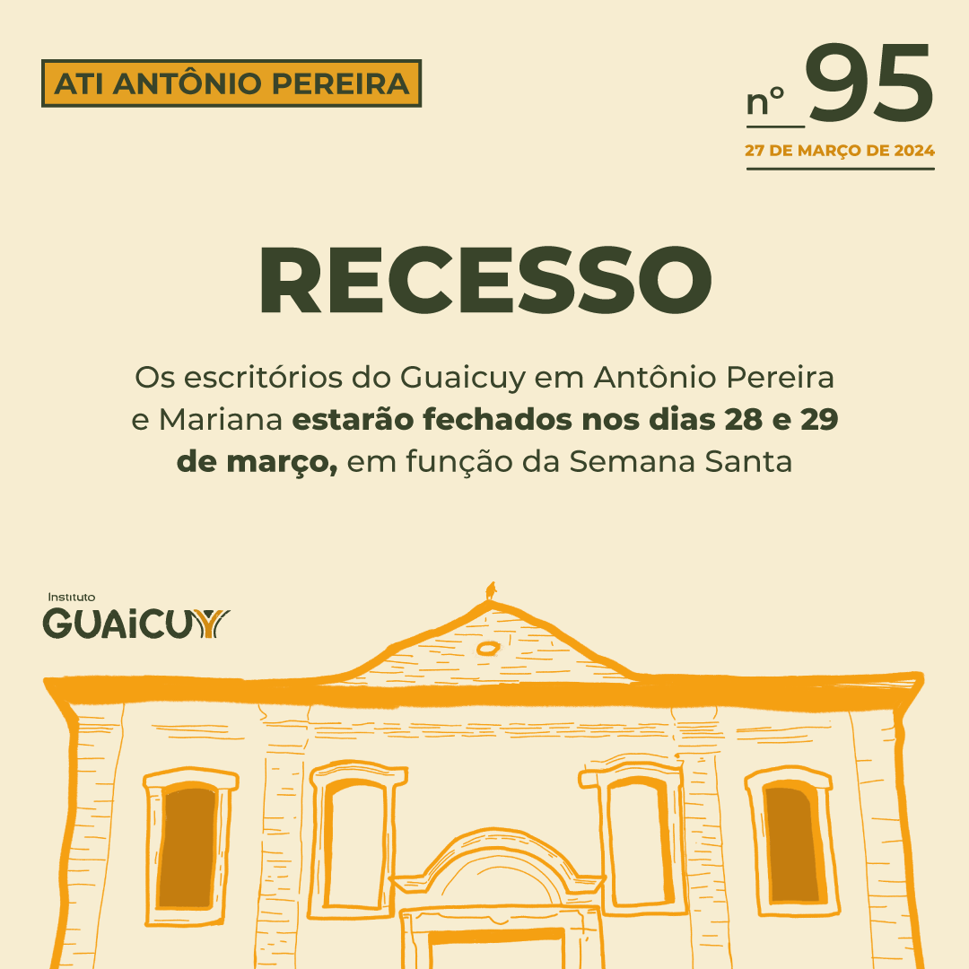 Informamos que as sedes do Instituto Guaicuy em Antônio Pereira e Mariana estarão fechadas nos dias 28 e 29 de março, quinta e sexta-feira, em função da Semana Santa. Caso necessário, entre em contato com o Acolhimento Digital!