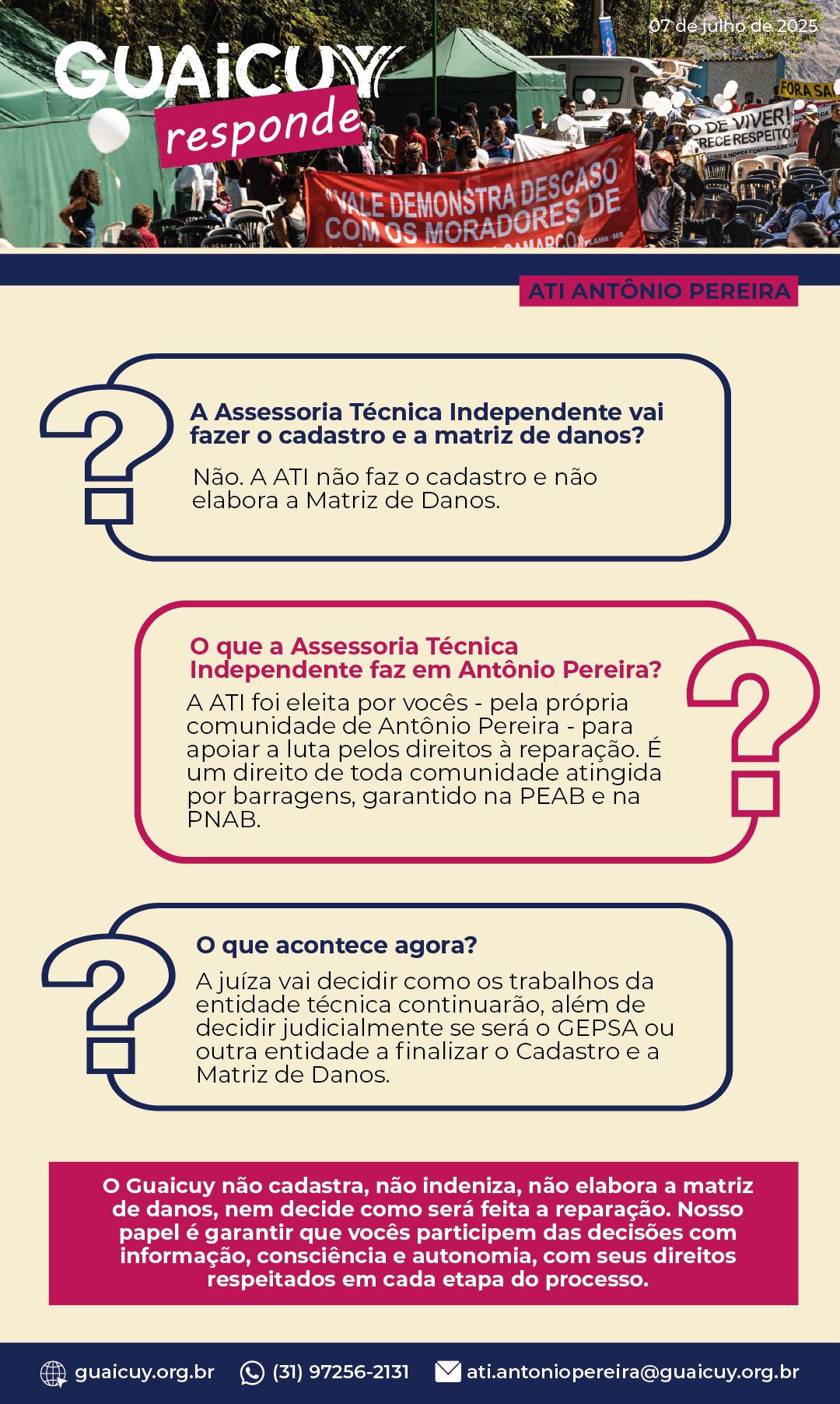 📱 Se você quer enviar sua pergunta para o Guaicuy, entre em contato com a gente pelo telefone ou WhatsApp (31) 97256-2131 ou pelo e-mail ati.antoniopereira@guaicuy.org.br.
