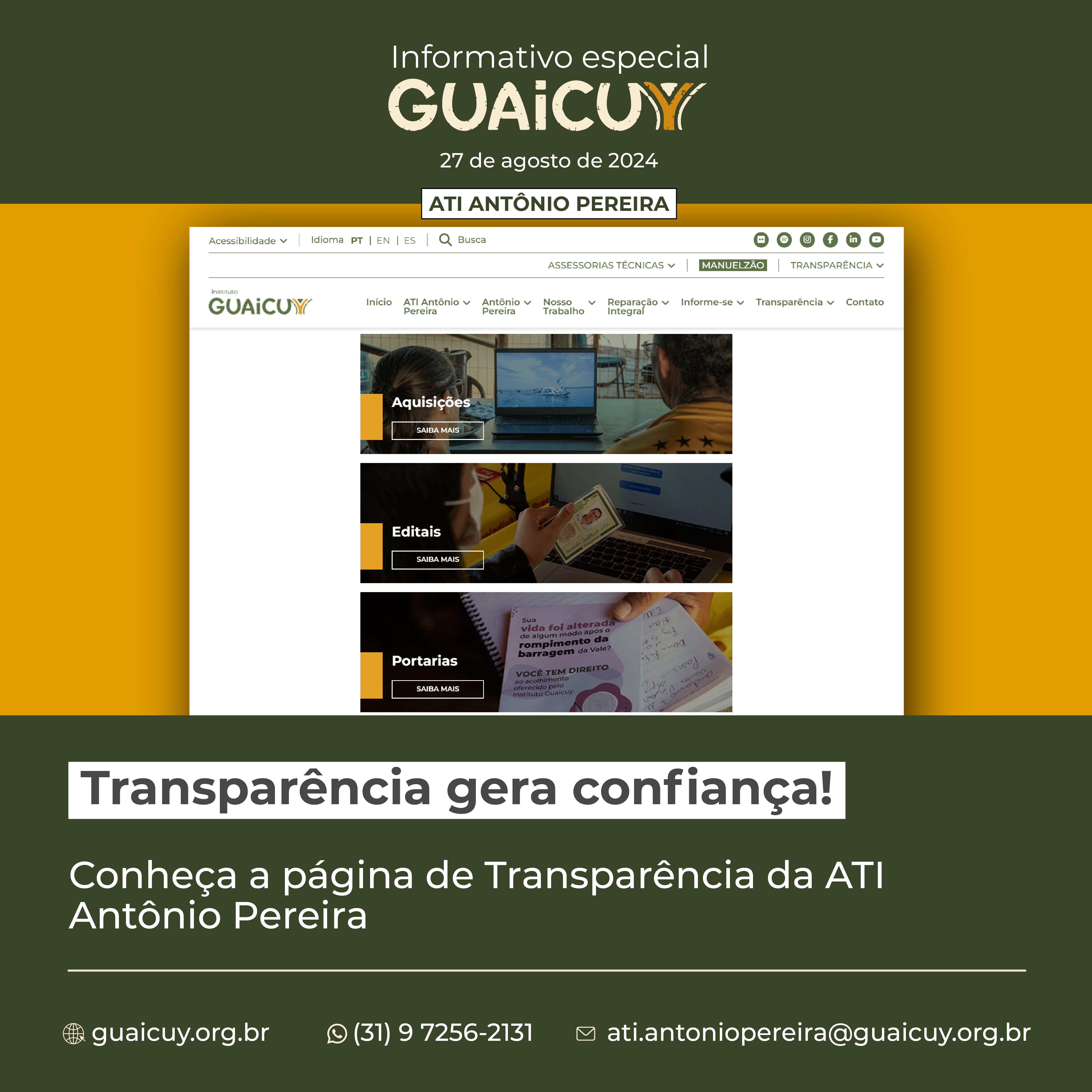 📲 O telefone para falar com o Instituto Guaicuy é (31) 97256-2131. Você pode ligar, mandar uma mensagem pelo WhatsApp ou enviar um e-mail para ati.antoniopereira@guaicuy.org.br
