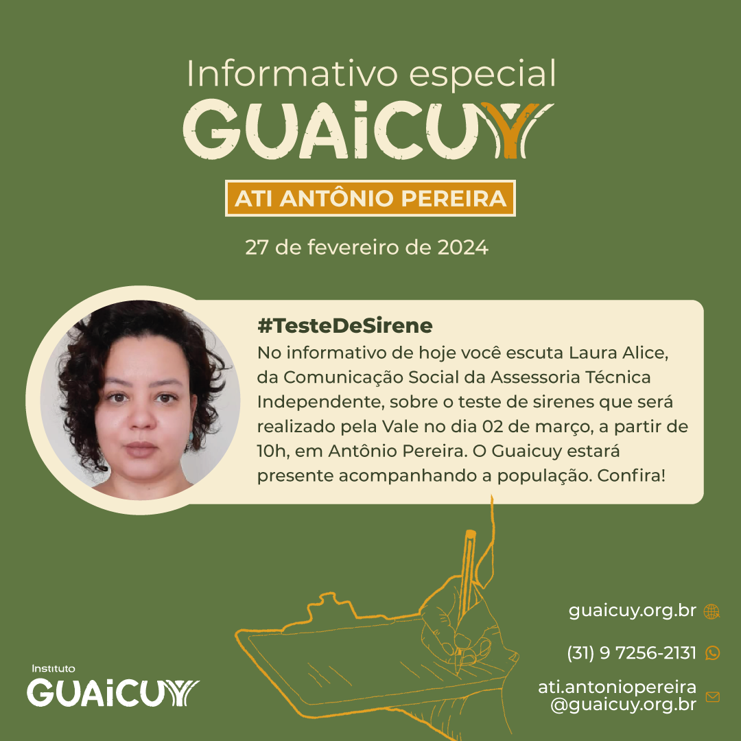 IMPORTANTE: Sabemos que essas ações de teste, mesmo estando previstas no Plano de Ação de Emergência de Barragens de Mineração (PAEBM), trazem inúmeros transtornos para a comunidade. Nesse sentido, o Instituto Guaicuy estará presente no momento do acionamento das sirenes acompanhando o processo.