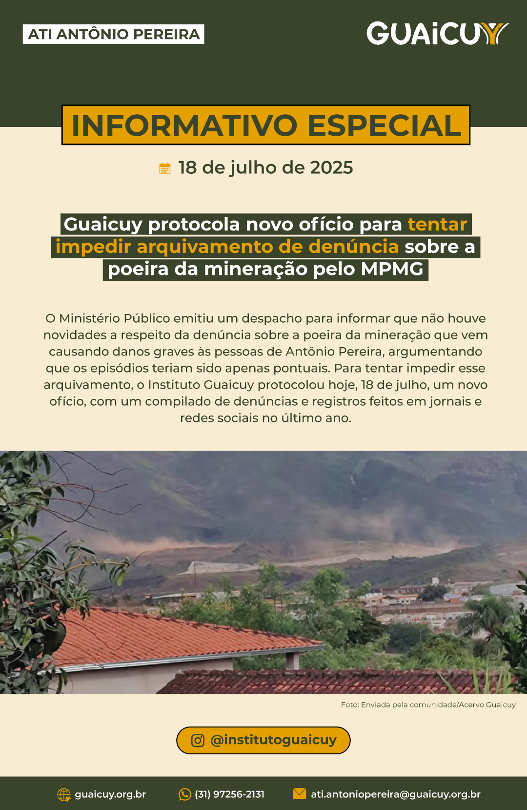Em abril deste ano, o Ministério Público do Estado de Minas Gerais (MPMG) emitiu um despacho para informar que não houve novidades a respeito da denúncia sobre a poeira da mineração que vem causando danos graves às pessoas de Antônio Pereira. No despacho, o Ministério Público argumentou que os episódios de nuvens de poeira teriam sido apenas pontuais. Isso poderia gerar o arquivamento da Notícia de Fato que nós, do Instituto Guaicuy, protocolamos em 2023.