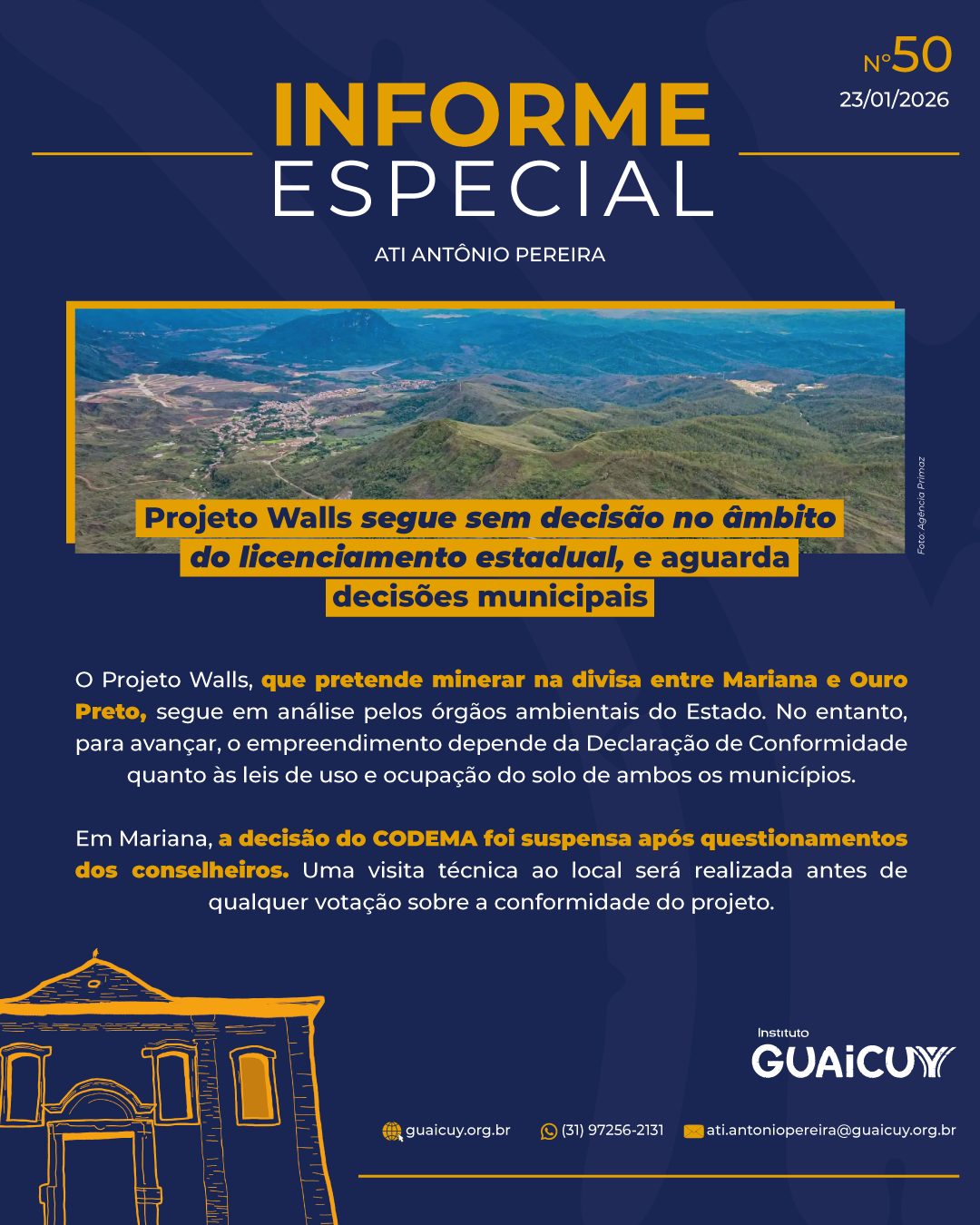 O Projeto Walls permanece sem autorização no âmbito do licenciamento ambiental estadual, aguardando os desdobramentos do processo no CODEMA de Mariana e Ouro Preto. O Instituto Guaicuy segue acompanhando o caso e informando a comunidade sobre qualquer atualização, reforçando a importância da transparência, da participação social e da proteção da Serra de Antônio Pereira e de seus atributos históricos, arqueológicos, ambientais e culturais.
