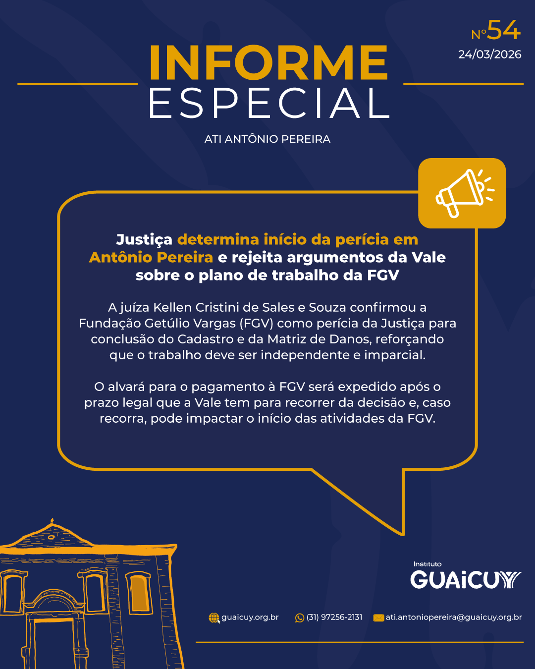 A perícia da FGV foi definida pela Justiça para concluir o Cadastro e entregar a Matriz de Danos da população de Antônio Pereira, etapa fundamental para que a reparação avance. Após a apresentação da proposta técnica, a Vale tentou, por meio de uma série de questionamentos, impor alterações no plano de trabalho da FGV, numa tentativa de interferir na forma como seriam conduzidos os dois instrumentos de reparação: a conclusão do Cadastro e da Matriz de Danos. Mas o único posicionamento acatado vem do Ministério Público de Estado de Minas Gerais – MPMG, que destacou a necessidade de auditoria externa acompanhando os trabalhos da perícia e atestando o gasto do dinheiro e o cumprimento do plano de trabalho apresentado pela instituição.