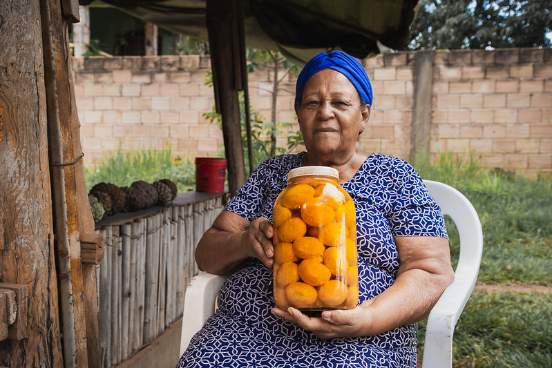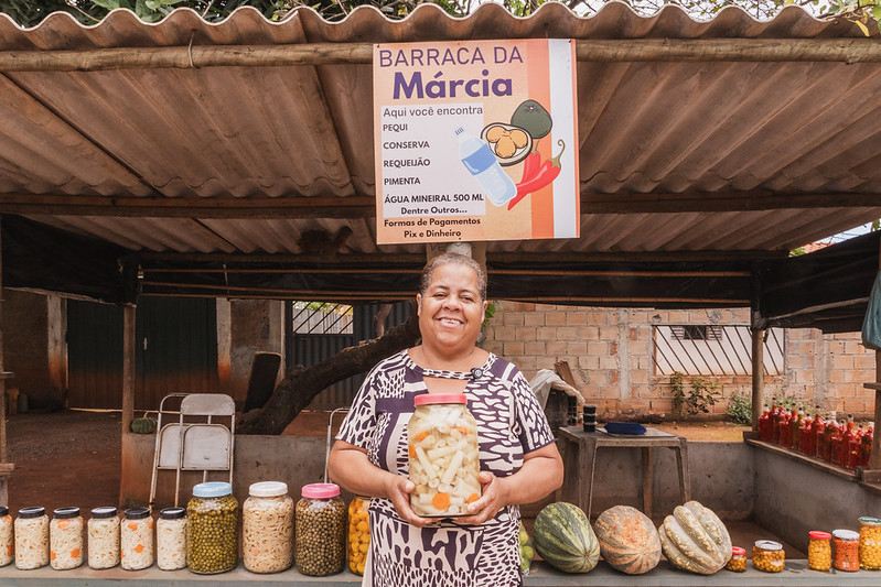 Márcia Gonçalves, mantém uma barraca em frente à sua casa. Ela lembra de sua mãe, que sempre a acompanhou na jornada de trabalho na barraca, e do pai, que começou a vender frutas do Cerrado na BR-040 depois que se aposentou. “Hoje mesmo me deu saudade demais dela. Fez quatro anos agora, no dia 18 de fevereiro, que Deus levou ela. Tudo o que eu mexo aqui, eu lembro dela. Porque ela tava pronta para me ajudar o tempo todo. Desde que eu tenho 12 anos de idade, que a gente vem mexendo na barraca. Quer seja junto com ela, ou com meu pai. Então, foi um legado que eles deixaram para nós, né? Ensinaram nós a trabalhar”, conta.