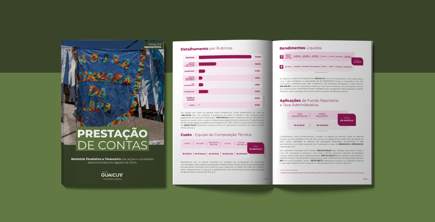 O presente relatório está organizado para possibilitar a compreensão da prestação de contas finalística junto à execução orçamentária, com objetivo de demonstrar de forma integrada as atividades da ATI em Antônio Pereira e permitir uma leitura que considere as diversas frentes de trabalho complementares e necessárias para abranger a complexidade do território. Assim, por meio do presente documento, é possível visualizar e acompanhar as ações mensais da supervisão Administrativa e Financeira e das coordenações de Comunicação Social e de Direitos e Participação Social.