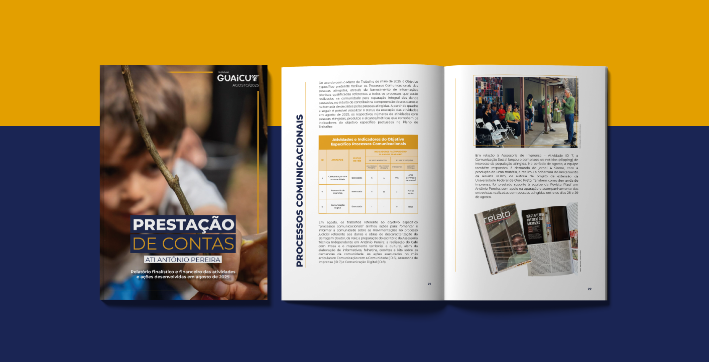 Em agosto, os trabalhos referente ao objetivo específico “processos comunicacionais” alinhou ações para: fomentar e informar a comunidade sobre as movimentações no processo judicial referente aos danos e obras de descaracterização da Barragem Doutor, da Vale; a preparação do escritório da Assessoria Técnica Independente em Antônio Pereira; a realização do Café com Prosa e o mapeamento territorial e cultural, além da elaboração de informativos, folhetins, convites e kits sobre as demandas da comunidade.