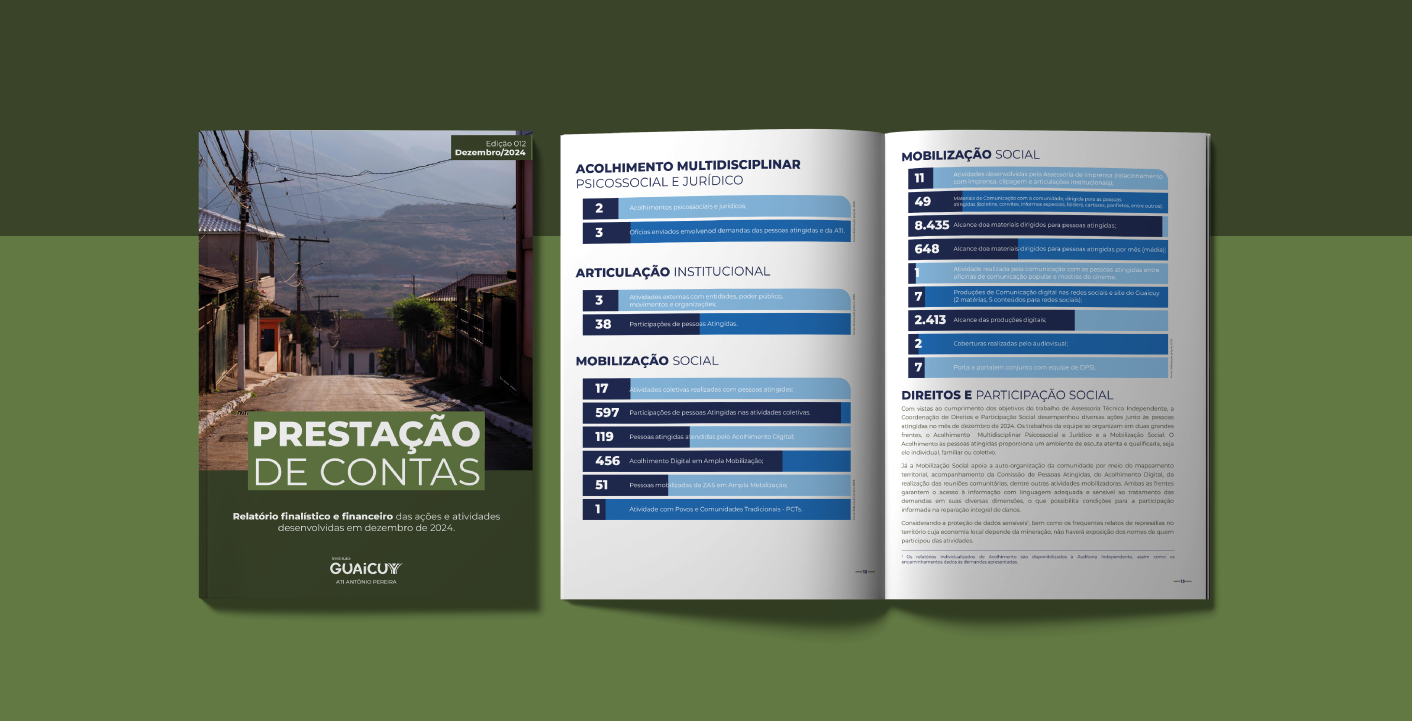 Conforme os relatórios mensais de prestações de contas, bem como os pareceres da auditoria contábil financeira e finalística independente, Baker Tilly Brasil, é possível identificar que o projeto continua em plena execução. O presente relatório está organizado para possibilitar a compreensão da prestação de contas finalística junto à execução orçamentária, com objetivo de demonstrar de forma integrada as atividades da ATI em Antônio Pereira. Assim, permitir uma leitura que considere as diversas frentes de trabalho complementares e necessárias para abranger a complexidade do território. Assim, por meio do presente documento, é possível visualizar e acompanhar as ações mensais da Supervisão Administrativa e Financeira e das Coordenações de Comunicação Social e de Direitos e Participação Social.