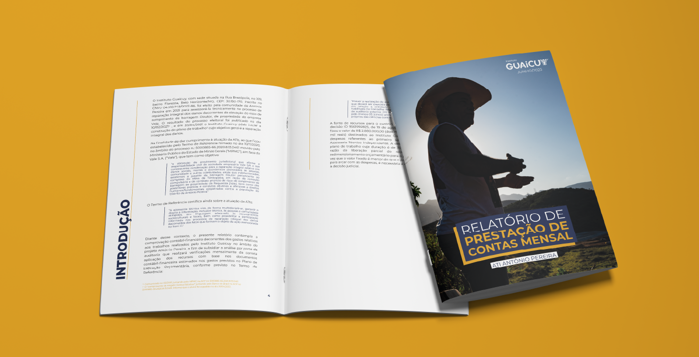Diante desse contexto, o presente relatório contempla a comprovação contábil-financeira decorrentes dos gastos relativos aos trabalhos realizados pelo Instituto Guaicuy no âmbito do projeto Antônio Pereira, a fim de subsidiar a análise por parte da auditoria que realizará verificações mensalmente da correta aplicação dos recursos com base nos documentos contábil-financeira estimados nos gastos previstos no Plano de Execução Orçamentária, conforme previsto no Termo de Referência:
